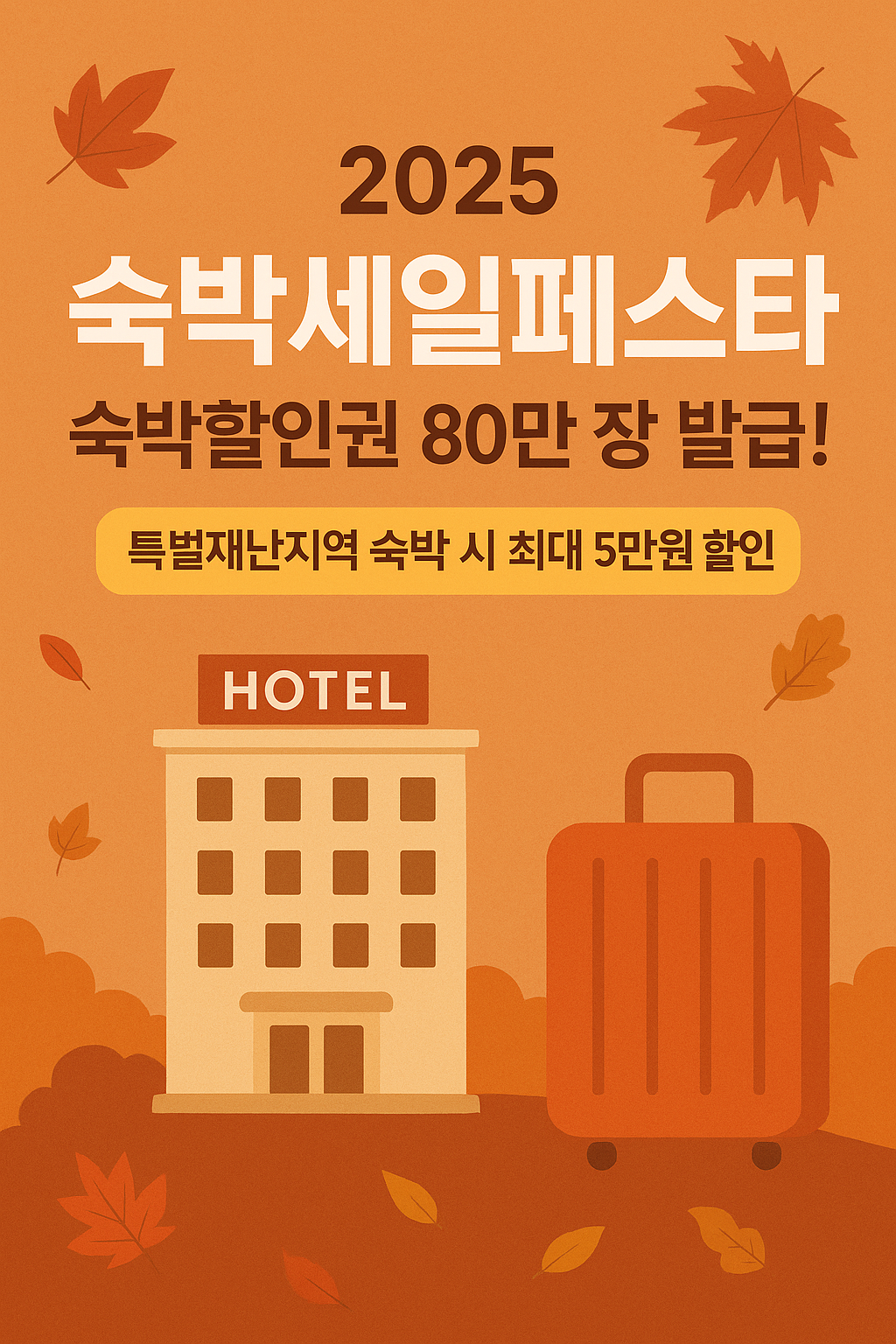 2025 숙박세일페스타숙박할인권 80만 장 발급! 특별재난지역 숙박 시 최대 5만 원 할인 🍂 정책 개요 정부는 올 가을과 겨울, 국내 관광을 촉진하고 지역경제를 살리기 위해 총 80만 장의 숙박할인권을 발급합니다. 이번 행사는 2025 숙박세일페스타라는 이름으로 진행되며, 문화체육관광부 공식 홈페이지와 한국관광공사 ‘대한민국 구석구석’ 웹사이트에서 공지됩니다. 📌 주요 지원내용 총 발급량: 80만 장 (가을 40만 장, 겨울 40만 장) 지원 조건: 7만 원 이상 숙박 시 3만 원 할인 특별재난지역 숙박: 최대 5만 원 할인 사용 가능 기간: 9월~11월, 12월~익년 1월 ..