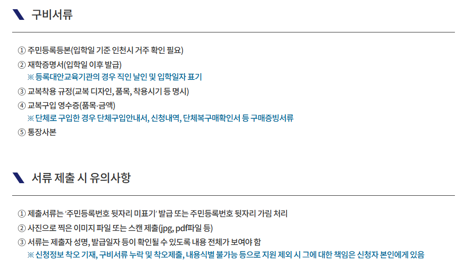 • 교복구입 영수증: 품목 및 금액 확인 가능해야 함.