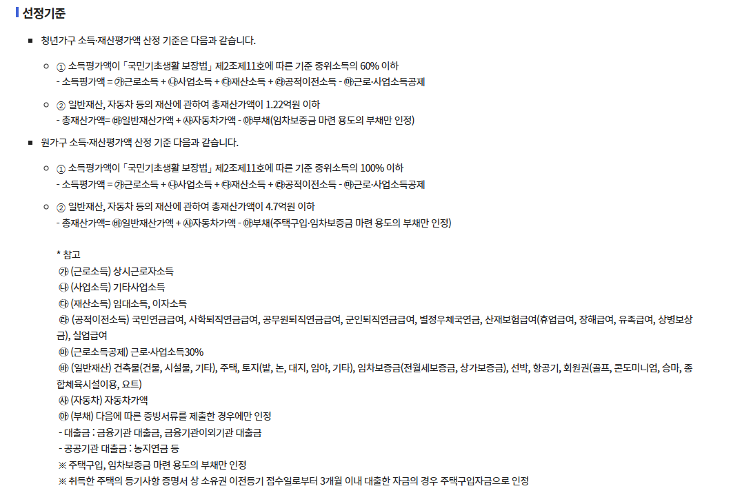 • 정부 청년월세 한시 특별지원: 청년가구 기준 중위소득 60% 이하, 원가구 100% 이하