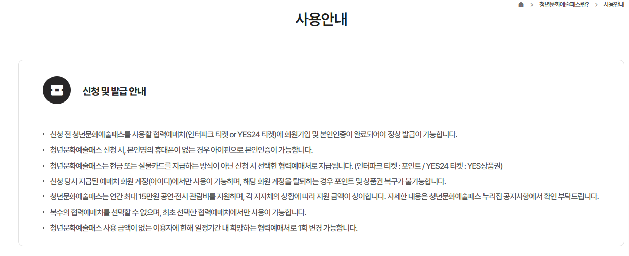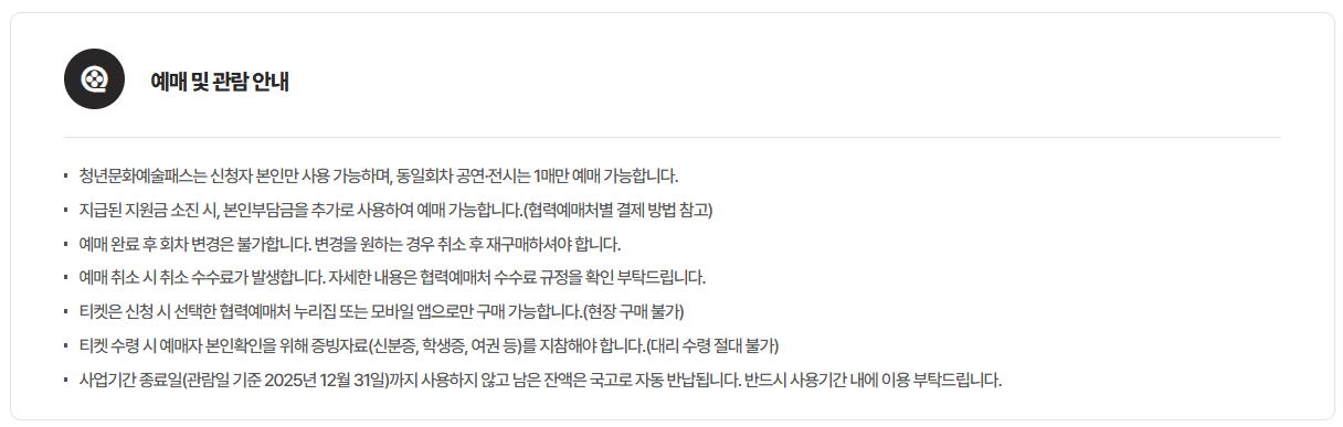 청년 문화예술패스를 신청하고 사용할 때 반드시 확인해야 할 유의사항은 다음과 같습니다: