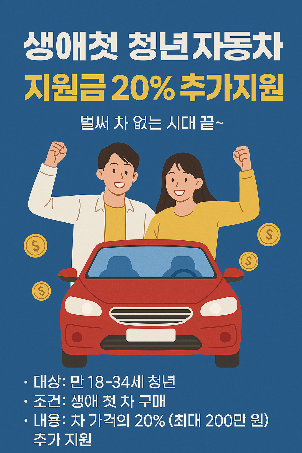 🚗 청년 생애 첫 전기차 구매 보조금 20% 추가 지원!청년들의 친환경차 구매 부담을 덜어주는 특별한 정부 정책!📌 정책 개요2025년부터 시행되는 이 정책은 만 19세~34세 청년이 생애 첫 차로 전기 승용차를 구매할 경우 기본 보조금 외에 추가로 20%의 국비 보조금을 지원하는 제도입니다. 이는 초기 구매 비용 부담을 줄이고 친환경차 보급을 확대하기 위한 정부의 노력입니다.👨🎓 지원 대상 및 주요 혜택지원 대상:만 19세~34세 청년생애 첫 차로 전기 승용차를 구매하는 경우기존 차량 소유 이력이 없는 자주요 혜택:국비 보조금의 추가 지원 (20%)지자체 보조금과 중복 가능최대 약 2,000만 원 이상의 보조금 혜택 가능"청년층의 경제적 부담을 줄이고 친환경 이동 수단을 선택할 수 있는 기회를..